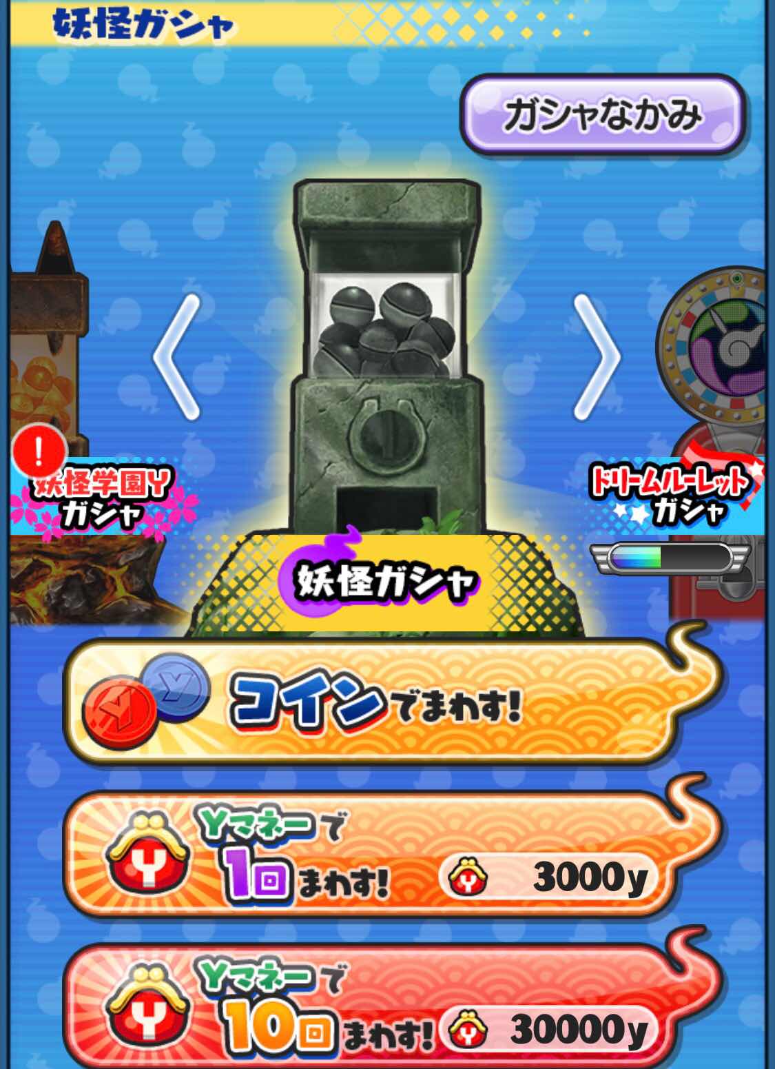 3000Yマネーで一回引ける妖怪ガシャですが、これで出る妖怪の技をMAXにする事でひっさつの秘伝書、小、ミニを大量に入手します。